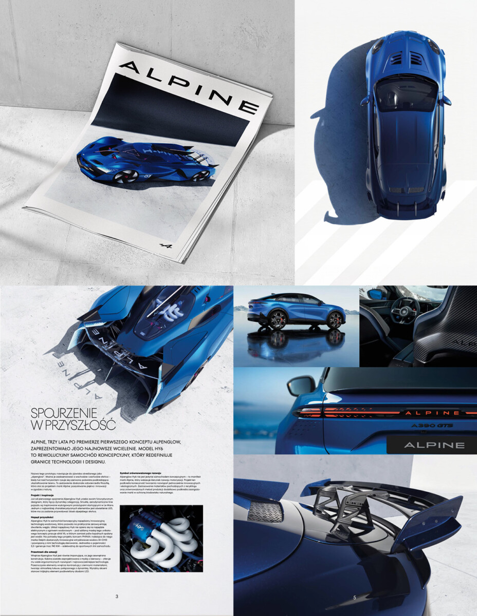 Śmiałą wizję przyszłości widać już na okładce – jednym z bohaterów tego wydania jest koncept Alpenglow HY6. Futurystyczne kształty supersamochodu Alpine skrywają innowacyjną technologię – silnik V6 zasilany wodorem, o niemal zerowej emisji spalin.