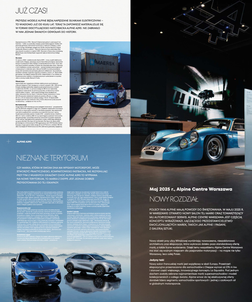 Plany marki również wyglądają ekscytująco. Niedawno zaprezentowano kompaktowy, dynamiczny model A290. Nawiązujący do kultowego Renault 5 Alpine z lat 70. XX w. samochód znalazł się także na łamach naszego wydawnictwa, podobnie jak najnowszy produkt marki – crossover A390, który w tym roku trafi do sprzedaży. Na łamach „Alpine Polska” znalazł się także doskonale znany model A110, ale w wyjątkowej wersji – po ośmiu latach od debiutu jego produkcja dobiega końca. Ostatnie wcielenie A110 to najbardziej ekstremalna i najmocniejsza wersja tego samochodu. W wydaniu nie zabrakło również relacji z otwarcia nowego budynku przy ul. Wirażowej w Warszawie – obecnie mieści się w nim siedziba Alpine Warszawa.