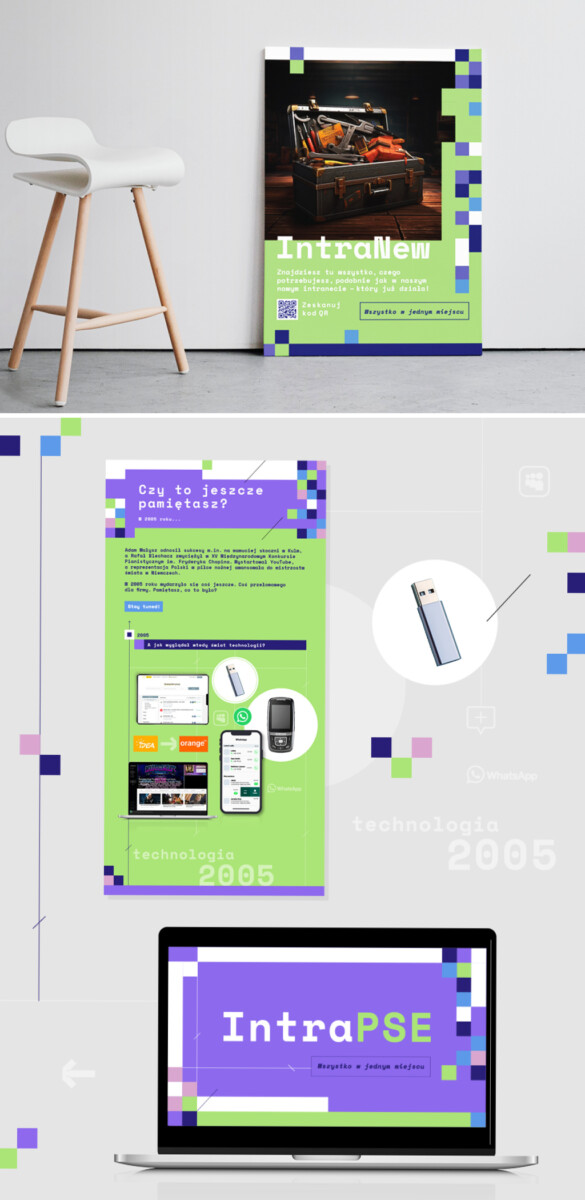 Zaczęliśmy więc od intrygującego teasera z grafiką urodzinową z tortem i świeczkami, by zaraz potem wysłać pracownikom mailing z tekstowym i graficznym podsumowaniem, jak świat wyglądał w 2005 r. Później przyszedł czas na konkrety. Określiliśmy cztery najważniejsze cechy nowego intranetu i do każdej z nich dopasowaliśmy jego funkcje i prostym językiem wytłumaczyliśmy, jak działają. Całość dopełnił nowoczesny layout, którego głównym elementem były małe kwadraciki – piksele – w kontrastowych kolorach. W ramach kampanii powstały też plakaty, leaflety i gadżety. Wszystko po to, by przez zmianę każdy mógł przejść łagodnie i jak najszybciej zacząć korzystać z nowoczesnego, intuicyjnego narzędzia.
